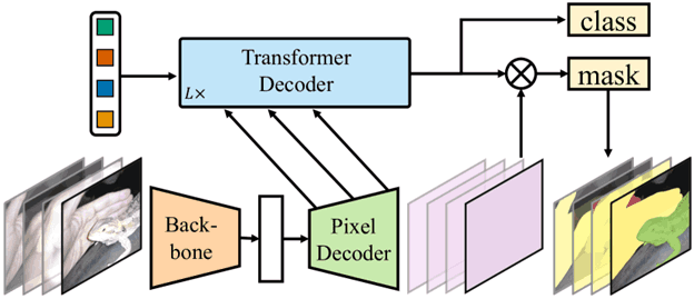 At its center, Mask2Former takes an image, extracts features using a CNN or Vision Transformer backbone, and then passes those features through a series of transformer decoder layers. What’s different here is how these decoders work.